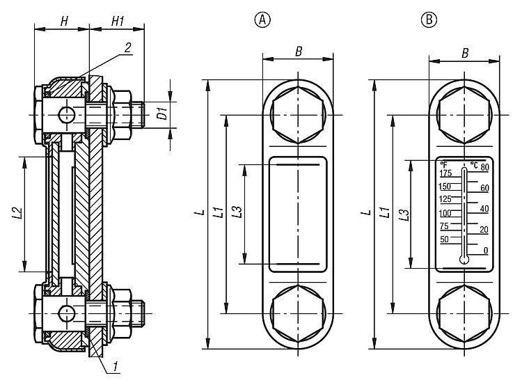 DescriptionMaterial:Housing steel. Viewing glass thermoplastic polyamide. O-ring and flat seal rubber (NBR). Reflector aluminium. Screw and hex nut steel.Version:Housing painted black. Transparent viewing glass, high mechanical stability, non-ageing, temperature resistant with oil up to 100 °C, with water up to 70 °C. Reflector painted white, markings and scale black. Screw and hexagon nut, electro zinc-plated.Note:The oil level gauges can either be fastened as shown in the illustration or directly in the threaded hole. Centre distance for the fastening holes = L1 ±0.5. The oil level gauges are suitable for tanks operating without pressure. Maximum operating temperature: 100 °C.Drawing reference: