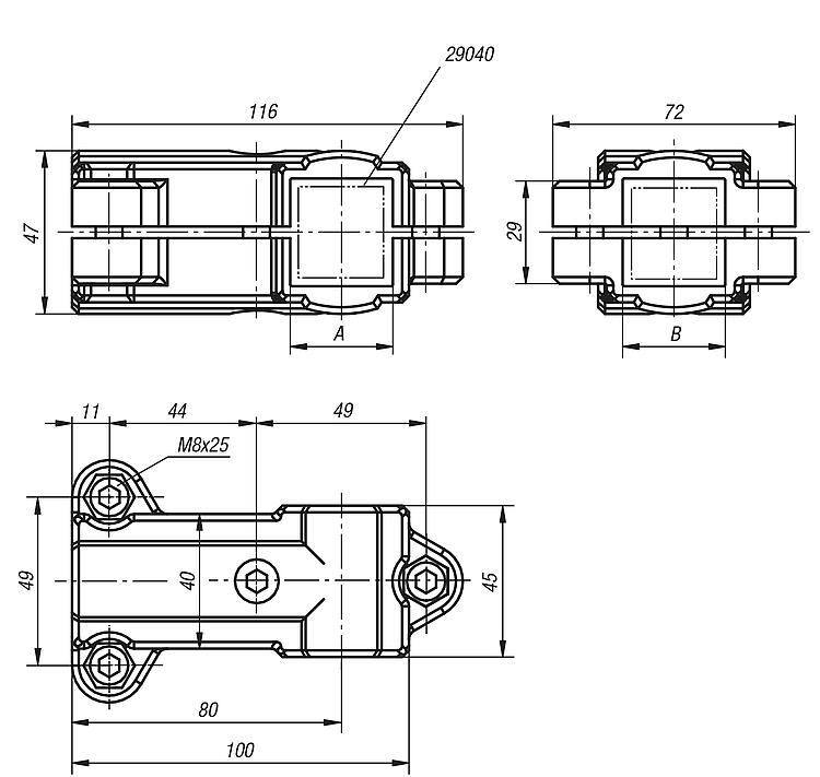 Note:These T-clamps are for 30 mm square tubes. Use reducer sleeves 29040 if smaller tubes are to be clamped or a conversion from square to round tubes is required.On request:Plastic clamping levers for tightening.Accessory:- Reducer sleeves 29040