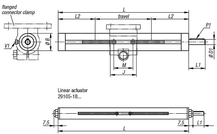 | Order No. | Version 1 | Type E | Spindle | L | Travel S | B | D1 | J | L1 | L2 | M | P1 parallel key DIN 6885 | V1 | CAD | Acc. | Price | Order |