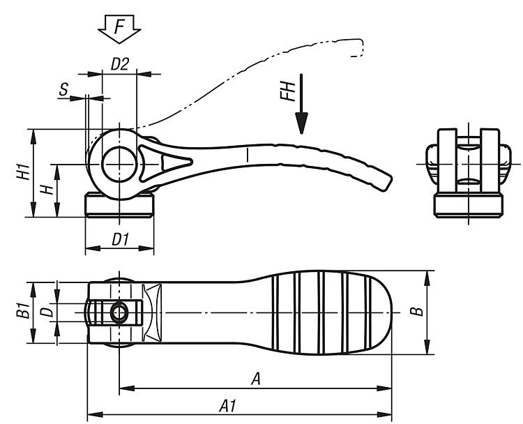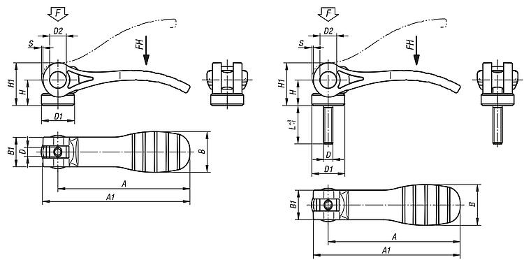 | Order No. | norelem old article number | Component material | Main colour | D | D1 | D2 | B | B1 | H | H1 | A | A1 | L | Travel S | Clamping force F (kN) | Hand force FH N | CAD | Acc. | Price | Order |