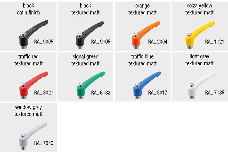 | 06451-92A2181 | jet black RAL 9005 | textured matt | 2 | 1/4-20 | 12 | 13,5 | 18,5 | 19 | 32 | 6,5 | 17,5 | 42,5 | 45,5 | 65 | 74,5 | 9,5 | 20 | | | on request | | | 06451-92A2182 | orange RAL 2004 | textured matt | 2 | 1/4-20 | 12 | 13,5 | 18,5 | 19 | 32 | 6,5 | 17,5 | 42,5 | 45,5 | 65 | 74,5 | 9,5 | 20 | | | on request | | | 06451-92A2183 | colza yellow RAL 1021 | textured matt | 2 | 1/4-20 | 12 | 13,5 | 18,5 | 19 | 32 | 6,5 | 17,5 | 42,5 | 45,5 | 65 | 74,5 | 9,5 | 20 | | | on request | | | 06451-92A2184 | traffic red RAL 3020 | textured matt | 2 | 1/4-20 | 12 | 13,5 | 18,5 | 19 | 32 | 6,5 | 17,5 | 42,5 | 45,5 | 65 | 74,5 | 9,5 | 20 | | | on request | | | 06451-92A2185 | signal green RAL 6032 | textured matt | 2 | 1/4-20 | 12 | 13,5 | 18,5 | 19 | 32 | 6,5 | 17,5 | 42,5 | 45,5 | 65 | 74,5 | 9,5 | 20 | | | on request | | | 06451-92A2186 | traffic blue RAL 5017 | textured matt | 2 | 1/4-20 | 12 | 13,5 | 18,5 | 19 | 32 | 6,5 | 17,5 | 42,5 | 45,5 | 65 | 74,5 | 9,5 | 20 | | | on request | | | 06451-92A2187 | light grey RAL 7035 | textured matt | 2 | 1/4-20 | 12 | 13,5 | 18,5 | 19 | 32 | 6,5 | 17,5 | 42,5 | 45,5 | 65 | 74,5 | 9,5 | 20 | | | on request | | | 06451-92A2188 | window grey RAL 7040 | textured matt | 2 | 1/4-20 | 12 | 13,5 | 18,5 | 19 | 32 | 6,5 | 17,5 | 42,5 | 45,5 | 65 | 74,5 | 9,5 | 20 | | | on request | | | 06451-92A3181 | jet black RAL 9005 | textured matt | 2 | 5/16-18 | 12 | 13,5 | 18,5 | 19 | 32 | 6,5 | 17,5 | 42,5 | 45,5 | 65 | 74,5 | 9,5 | 20 | | | on request | | | 06451-92A3182 | orange RAL 2004 | textured matt | 2 | 5/16-18 | 12 | 13,5 | 18,5 | 19 | 32 | 6,5 | 17,5 | 42,5 | 45,5 | 65 | 74,5 | 9,5 | 20 | | | on request | | | 06451-92A3183 | colza yellow RAL 1021 | textured matt | 2 | 5/16-18 | 12 | 13,5 | 18,5 | 19 | 32 | 6,5 | 17,5 | 42,5 | 45,5 | 65 | 74,5 | 9,5 | 20 | | | on request | | | 06451-92A3184 | traffic red RAL 3020 | textured matt | 2 | 5/16-18 | 12 | 13,5 | 18,5 | 19 | 32 | 6,5 | 17,5 | 42,5 | 45,5 | 65 | 74,5 | 9,5 | 20 | | | on request | | | 06451-92A3185 | signal green RAL 6032 | textured matt | 2 | 5/16-18 | 12 | 13,5 | 18,5 | 19 | 32 | 6,5 | 17,5 | 42,5 | 45,5 | 65 | 74,5 | 9,5 | 20 | | | on request | | | 06451-92A3186 | traffic blue RAL 5017 | textured matt | 2 | 5/16-18 | 12 | 13,5 | 18,5 | 19 | 32 | 6,5 | 17,5 | 42,5 | 45,5 | 65 | 74,5 | 9,5 | 20 | | | on request | | | 06451-92A3187 | light grey RAL 7035 | textured matt | 2 | 5/16-18 | 12 | 13,5 | 18,5 | 19 | 32 | 6,5 | 17,5 | 42,5 | 45,5 | 65 | 74,5 | 9,5 | 20 | | | on request | | | 06451-92A3188 | window grey RAL 7040 | textured matt | 2 | 5/16-18 | 12 | 13,5 | 18,5 | 19 | 32 | 6,5 | 17,5 | 42,5 | 45,5 | 65 | 74,5 | 9,5 | 20 | | | on request | | | 06451-93A3181 | jet black RAL 9005 | textured matt | 3 | 5/16-18 | 14 | 16 | 21 | 22 | 41,5 | 10 | 24 | 54,5 | 58,5 | 80 | 91 | 11 | 22 | | | on request | | | 06451-93A3182 | orange RAL 2004 | textured matt | 3 | 5/16-18 | 14 | 16 | 21 | 22 | 41,5 | 10 | 24 | 54,5 | 58,5 | 80 | 91 | 11 | 22 | | | on request | | | 06451-93A3183 | colza yellow RAL 1021 | textured matt | 3 | 5/16-18 | 14 | 16 | 21 | 22 | 41,5 | 10 | 24 | 54,5 | 58,5 | 80 | 91 | 11 | 22 | | | on request | | | 06451-93A3184 | traffic red RAL 3020 | textured matt | 3 | 5/16-18 | 14 | 16 | 21 | 22 | 41,5 | 10 | 24 | 54,5 | 58,5 | 80 | 91 | 11 | 22 | | | on request | | | 06451-93A3185 | signal green RAL 6032 | textured matt | 3 | 5/16-18 | 14 | 16 | 21 | 22 | 41,5 | 10 | 24 | 54,5 | 58,5 | 80 | 91 | 11 | 22 | | | on request | | | 06451-93A3186 | traffic blue RAL 5017 | textured matt | 3 | 5/16-18 | 14 | 16 | 21 | 22 | 41,5 | 10 | 24 | 54,5 | 58,5 | 80 | 91 | 11 | 22 | | | on request | | | 06451-93A3187 | light grey RAL 7035 | textured matt | 3 | 5/16-18 | 14 | 16 | 21 | 22 | 41,5 | 10 | 24 | 54,5 | 58,5 | 80 | 91 | 11 | 22 | | | on request | | | 06451-93A3188 | window grey RAL 7040 | textured matt | 3 | 5/16-18 | 14 | 16 | 21 | 22 | 41,5 | 10 | 24 | 54,5 | 58,5 | 80 | 91 | 11 | 22 | | | on request | | | 06451-93A4181 | jet black RAL 9005 | textured matt | 3 | 3/8-16 | 14 | 16 | 21 | 22 | 41,5 | 10 | 24 | 54,5 | 58,5 | 80 | 91 | 11 | 22 | | | on request | | | 06451-93A4182 | orange RAL 2004 | textured matt | 3 | 3/8-16 | 14 | 16 | 21 | 22 | 41,5 | 10 | 24 | 54,5 | 58,5 | 80 | 91 | 11 | 22 | | | on request | | | 06451-93A4183 | colza yellow RAL 1021 | textured matt | 3 | 3/8-16 | 14 | 16 | 21 | 22 | 41,5 | 10 | 24 | 54,5 | 58,5 | 80 | 91 | 11 | 22 | | | on request | | | 06451-93A4184 | traffic red RAL 3020 | textured matt | 3 | 3/8-16 | 14 | 16 | 21 | 22 | 41,5 | 10 | 24 | 54,5 | 58,5 | 80 | 91 | 11 | 22 | | | on request | | | 06451-93A4185 | signal green RAL 6032 | textured matt | 3 | 3/8-16 | 14 | 16 | 21 | 22 | 41,5 | 10 | 24 | 54,5 | 58,5 | 80 | 91 | 11 | 22 | | | on request | | | 06451-93A4186 | traffic blue RAL 5017 | textured matt | 3 | 3/8-16 | 14 | 16 | 21 | 22 | 41,5 | 10 | 24 | 54,5 | 58,5 | 80 | 91 | 11 | 22 | | | on request | | | 06451-93A4187 | light grey RAL 7035 | textured matt | 3 | 3/8-16 | 14 | 16 | 21 | 22 | 41,5 | 10 | 24 | 54,5 | 58,5 | 80 | 91 | 11 | 22 | | | on request | | | 06451-93A4188 | window grey RAL 7040 | textured matt | 3 | 3/8-16 | 14 | 16 | 21 | 22 | 41,5 | 10 | 24 | 54,5 | 58,5 | 80 | 91 | 11 | 22 | | | on request | |