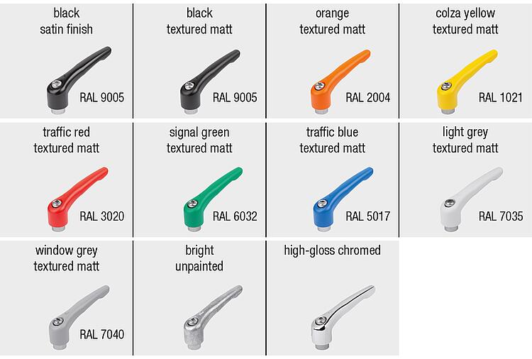 | 06451-9AD181 | jet black RAL 9005 | textured matt | 9 | 6-32 | 6 | 8 | 11 | 11,5 | 21,4 | 4 | 11,9 | 24 | 27 | 22 | 27,7 | 6,4 | 12 |  | | on request | | | 06451-9AE181 | jet black RAL 9005 | textured matt | 9 | 8-32 | 6 | 8 | 11 | 11,5 | 21,4 | 4 | 11,9 | 24 | 27 | 22 | 27,7 | 6,4 | 12 |  | | on request | | | 06451-9A1181 | jet black RAL 9005 | textured matt | 9 | 10-32 | 6 | 8 | 11 | 11,5 | 21,4 | 4 | 11,9 | 24 | 27 | 22 | 27,7 | 6,4 | 12 |  | | on request | | | 06451-0AD181 | jet black RAL 9005 | textured matt | 0 | 6-32 | 9 | 10 | 13 | 14 | 24,5 | 4 | 14,5 | 30 | 33 | 30 | 37 | 7 | 16 |  | | on request | | | 06451-0AE181 | jet black RAL 9005 | textured matt | 0 | 8-32 | 9 | 10 | 13 | 14 | 24,5 | 4 | 14,5 | 30 | 33 | 30 | 37 | 7 | 16 |  | | on request | | | 06451-0A0181 | jet black RAL 9005 | textured matt | 0 | 10-24 | 9 | 10 | 13 | 14 | 24,5 | 4 | 14,5 | 30 | 33 | 30 | 37 | 7 | 16 |  | | on request | | | 06451-0A1181 | jet black RAL 9005 | textured matt | 0 | 10-32 | 9 | 10 | 13 | 14 | 24,5 | 4 | 14,5 | 30 | 33 | 30 | 37 | 7 | 16 |  | | on request | | | 06451-0A2181 | jet black RAL 9005 | textured matt | 0 | 1/4-20 | 9 | 10 | 13 | 14 | 24,5 | 4 | 14,5 | 30 | 33 | 30 | 37 | 7 | 16 |  | | on request | | | 06451-1A0181 | jet black RAL 9005 | textured matt | 1 | 10-24 | 9 | 10 | 13 | 14 | 24,5 | 4 | 14,5 | 31 | 34 | 40 | 47 | 7 | 16 |  | | on request | | | 06451-1A1181 | jet black RAL 9005 | textured matt | 1 | 10-32 | 9 | 10 | 13 | 14 | 24,5 | 4 | 14,5 | 31 | 34 | 40 | 47 | 7 | 16 |  | | on request | | | 06451-1A2181 | jet black RAL 9005 | textured matt | 1 | 1/4-20 | 9 | 10 | 13 | 14 | 24,5 | 4 | 14,5 | 31 | 34 | 40 | 47 | 7 | 16 |  | | on request | | | 06451-2A2181 | jet black RAL 9005 | textured matt | 2 | 1/4-20 | 12 | 13,5 | 18,5 | 19 | 28,5 | 6,5 | 17,5 | 42,5 | 45,5 | 65 | 74,5 | 9,5 | 20 |  | | on request | | | 06451-2A3181 | jet black RAL 9005 | textured matt | 2 | 5/16-18 | 12 | 13,5 | 18,5 | 19 | 28,5 | 6,5 | 17,5 | 42,5 | 45,5 | 65 | 74,5 | 9,5 | 20 |  | | on request | | | 06451-3A3181 | jet black RAL 9005 | textured matt | 3 | 5/16-18 | 14 | 16 | 21 | 22 | 37 | 10 | 24 | 54,5 | 58,5 | 80 | 91 | 11 | 22 |  | | on request | | | 06451-3A4181 | jet black RAL 9005 | textured matt | 3 | 3/8-16 | 14 | 16 | 21 | 22 | 37 | 10 | 24 | 54,5 | 58,5 | 80 | 91 | 11 | 22 |  | | on request | | | 06451-4A4181 | jet black RAL 9005 | textured matt | 4 | 3/8-16 | 17 | 19 | 27 | 27,5 | 43 | 10 | 27 | 63 | 67,5 | 95 | 109 | 13 | 24 |  | | on request | | | 06451-4A5181 | jet black RAL 9005 | textured matt | 4 | 1/2-13 | 17 | 19 | 27 | 27,5 | 43 | 10 | 27 | 63 | 67,5 | 95 | 109 | 13 | 24 |  | | on request | | | 06451-5A5181 | jet black RAL 9005 | textured matt | 5 | 1/2-13 | 23 | 23 | 31 | 32 | 49 | 12 | 31,5 | 73 | 77,5 | 110 | 126 | 15 | 26 |  | | on request | | | 06451-5A6181 | jet black RAL 9005 | textured matt | 5 | 5/8-11 | 23 | 23 | 31 | 32 | 49 | 12 | 31,5 | 73 | 77,5 | 110 | 126 | 15 | 26 |  | | on request | | | 06451-9AD182 | orange RAL 2004 | textured matt | 9 | 6-32 | 6 | 8 | 11 | 11,5 | 21,4 | 4 | 11,9 | 24 | 27 | 22 | 27,7 | 6,4 | 12 |  | | on request | | | 06451-9AE182 | orange RAL 2004 | textured matt | 9 | 8-32 | 6 | 8 | 11 | 11,5 | 21,4 | 4 | 11,9 | 24 | 27 | 22 | 27,7 | 6,4 | 12 |  | | on request | | | 06451-9A1182 | orange RAL 2004 | textured matt | 9 | 10-32 | 6 | 8 | 11 | 11,5 | 21,4 | 4 | 11,9 | 24 | 27 | 22 | 27,7 | 6,4 | 12 |  | | on request | | | 06451-0AD182 | orange RAL 2004 | textured matt | 0 | 6-32 | 9 | 10 | 13 | 14 | 24,5 | 4 | 14,5 | 30 | 33 | 30 | 37 | 7 | 16 |  | | on request | | | 06451-0AE182 | orange RAL 2004 | textured matt | 0 | 8-32 | 9 | 10 | 13 | 14 | 24,5 | 4 | 14,5 | 30 | 33 | 30 | 37 | 7 | 16 |  | | on request | | | 06451-0A0182 | orange RAL 2004 | textured matt | 0 | 10-24 | 9 | 10 | 13 | 14 | 24,5 | 4 | 14,5 | 30 | 33 | 30 | 37 | 7 | 16 |  | | on request | | | 06451-0A1182 | orange RAL 2004 | textured matt | 0 | 10-32 | 9 | 10 | 13 | 14 | 24,5 | 4 | 14,5 | 30 | 33 | 30 | 37 | 7 | 16 |  | | on request | | | 06451-0A2182 | orange RAL 2004 | textured matt | 0 | 1/4-20 | 9 | 10 | 13 | 14 | 24,5 | 4 | 14,5 | 30 | 33 | 30 | 37 | 7 | 16 |  | | on request | | | 06451-1A0182 | orange RAL 2004 | textured matt | 1 | 10-24 | 9 | 10 | 13 | 14 | 24,5 | 4 | 14,5 | 31 | 34 | 40 | 47 | 7 | 16 |  | | on request | | | 06451-1A1182 | orange RAL 2004 | textured matt | 1 | 10-32 | 9 | 10 | 13 | 14 | 24,5 | 4 | 14,5 | 31 | 34 | 40 | 47 | 7 | 16 |  | | on request | | | 06451-1A2182 | orange RAL 2004 | textured matt | 1 | 1/4-20 | 9 | 10 | 13 | 14 | 24,5 | 4 | 14,5 | 31 | 34 | 40 | 47 | 7 | 16 |  | | on request | | | 06451-2A2182 | orange RAL 2004 | textured matt | 2 | 1/4-20 | 12 | 13,5 | 18,5 | 19 | 28,5 | 6,5 | 17,5 | 42,5 | 45,5 | 65 | 74,5 | 9,5 | 20 |  | | on request | | | 06451-2A3182 | orange RAL 2004 | textured matt | 2 | 5/16-18 | 12 | 13,5 | 18,5 | 19 | 28,5 | 6,5 | 17,5 | 42,5 | 45,5 | 65 | 74,5 | 9,5 | 20 |  | | on request | | | 06451-3A3182 | orange RAL 2004 | textured matt | 3 | 5/16-18 | 14 | 16 | 21 | 22 | 37 | 10 | 24 | 54,5 | 58,5 | 80 | 91 | 11 | 22 |  | | on request | | | 06451-3A4182 | orange RAL 2004 | textured matt | 3 | 3/8-16 | 14 | 16 | 21 | 22 | 37 | 10 | 24 | 54,5 | 58,5 | 80 | 91 | 11 | 22 |  | | on request | | | 06451-4A4182 | orange RAL 2004 | textured matt | 4 | 3/8-16 | 17 | 19 | 27 | 27,5 | 43 | 10 | 27 | 63 | 67,5 | 95 | 109 | 13 | 24 |  | | on request | | | 06451-4A5182 | orange RAL 2004 | textured matt | 4 | 1/2-13 | 17 | 19 | 27 | 27,5 | 43 | 10 | 27 | 63 | 67,5 | 95 | 109 | 13 | 24 |  | | on request | | | 06451-5A5182 | orange RAL 2004 | textured matt | 5 | 1/2-13 | 23 | 23 | 31 | 32 | 49 | 12 | 31,5 | 73 | 77,5 | 110 | 126 | 15 | 26 |  | | on request | | | 06451-5A6182 | orange RAL 2004 | textured matt | 5 | 5/8-11 | 23 | 23 | 31 | 32 | 49 | 12 | 31,5 | 73 | 77,5 | 110 | 126 | 15 | 26 |  | | on request | | | 06451-9AD183 | colza yellow RAL 1021 | textured matt | 9 | 6-32 | 6 | 8 | 11 | 11,5 | 21,4 | 4 | 11,9 | 24 | 27 | 22 | 27,7 |