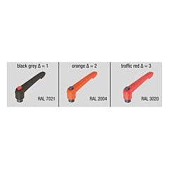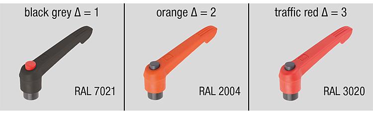 DescriptionMaterial:Handle fibreglass reinforced plastic, toothed ring die-cast zinc. Steel parts grade 5.8. Push button plastic (POM).Version:Steel parts black oxidised.Note:∆ Enter the desired lever colour here. The standard colours are: Black grey clamping lever, traffic red push button. Orange clamping lever, black grey push button. Traffic red clamping lever, black grey push button.On request:Other threads and special versions. Dimension “H1” available in other lengths at extra charge.Special features: DownloadHere is all the information as a PDF datasheet: