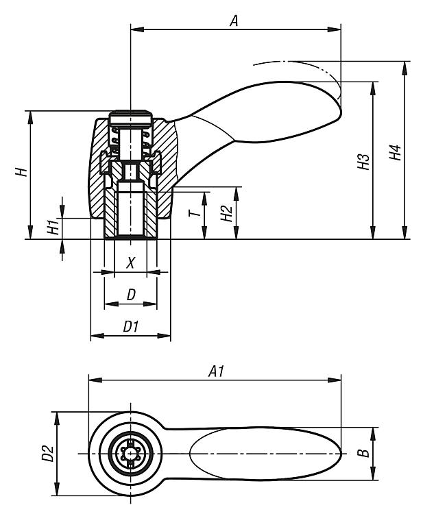 Clamping levers 2K with internal thread, threaded insert...