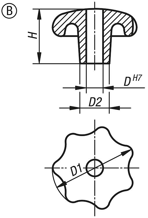 Star grips DIN 6336, grey cast iron, Form B, drilled through - inch