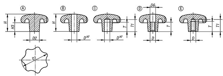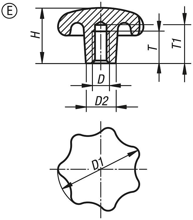 Star grips DIN 6336, grey cast iron, Form E, blind tapped hole - inch