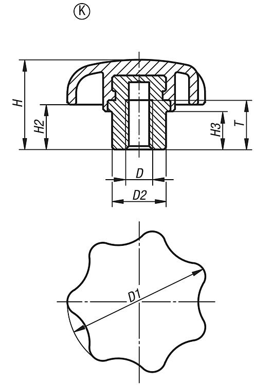 Version:Metal parts trivalent blue passivated steel or bright stainless steel.Note:The projecting steel bush make these star grips particularly suitable for cross pinning or fixating with a grub screw.Drawing reference: