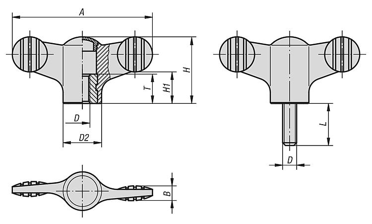 Wing grips, plastic with cap, threaded insert steel or stainless steel, with external thread - inch |