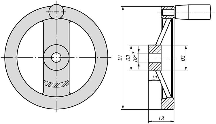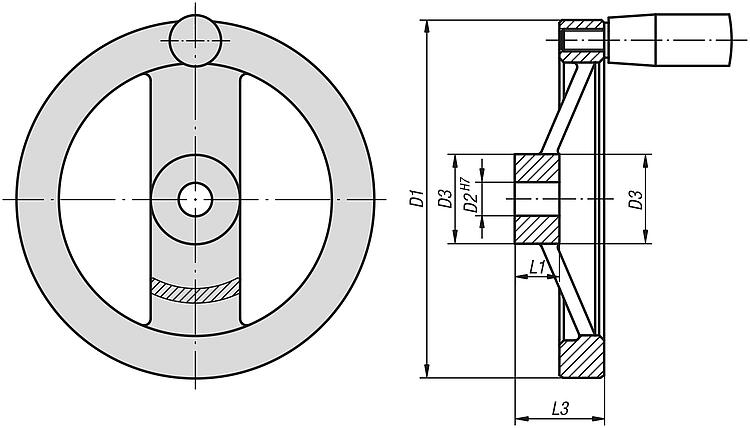 Note:For the inch series, dimension D2 is in inches, all other dimensions are in mm.On request:Hubs with square socket or powder-coated handwheels.Special features: