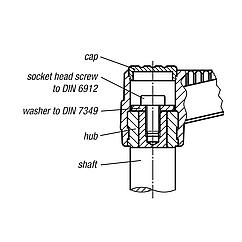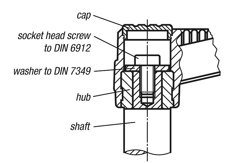 DescriptionMaterial:Black grey thermoplastic.Version:Steel parts black oxidised.Note:The hub cap is supplied loose. The crank handle can be secured to a shaft using a transverse pin or by parallel key connection together with a DIN 6912 socket head screw and a DIN 7349 washer.Special features: DownloadHere is all the information as a PDF datasheet: