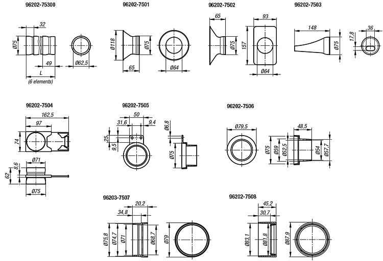 DescriptionMaterial:Acetal copolymer (POM). 96202-7508 PVC.Version:Flexible hose, blue. Accessories, orange. 96202-7508 white.Note:Flexible hose for extracting swarf, smoke, lubricant mist, steam, gases and other media; can be connected to a central extraction system or an industrial vacuum cleaner. It can be extended and shortened as needed. Free hanging lengths of up to 100 cm are possible without the need for support; 360° loops can be formed with a radius of 150 mm. Precise adjustment, vibration resistant, position reliability. Combinable with nozzles and accessories as required.