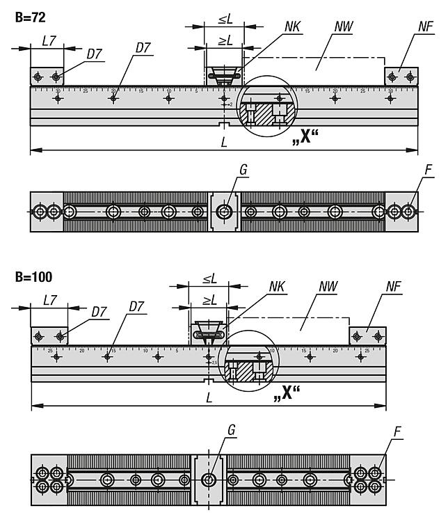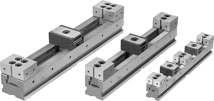 应用:可依次或彼此相邻安装多条不同长度的多重夹紧系统。通过精密齿轮可以非常精确的定位固定卡爪。夹紧条的横向刻度可以记录下固定卡爪的每个位置,并在重复时进行相同的设置。可将挡块安装到侧面螺纹孔处。
