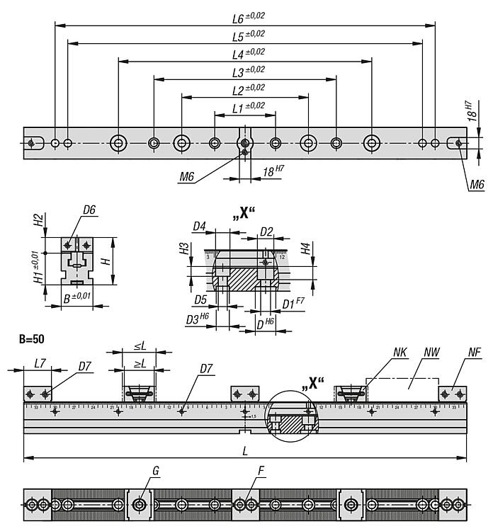 6. 用于孔间距为 40 和 50 mm 的网格系统的定位孔 Ø12F7 和 Ø16F7。