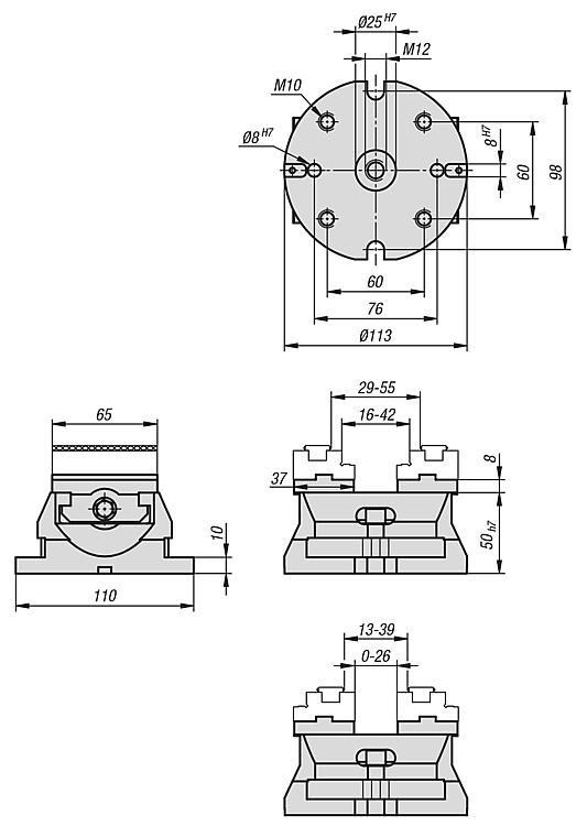 建议使用扭矩扳手控制夹持力。 特征:- 体式夹紧滑板和主轴螺母 - 槽和固定螺纹用于固定顶部卡爪 - 使用反向卡爪(配件)和工件挡块的侧面螺纹,可实现较大的夹紧范围 - 利于排出切屑和冷却剂特点: 下载此处为收集信息的 PDF: