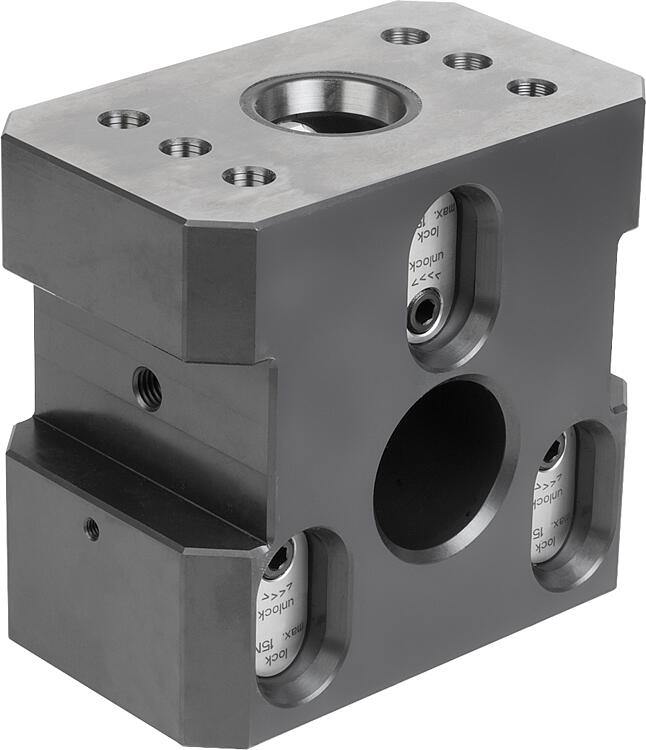 提示:UNILOCK 5 轴基本模块 DUO 有三个夹紧销接口,用于稳定地在高处构造重型工件。