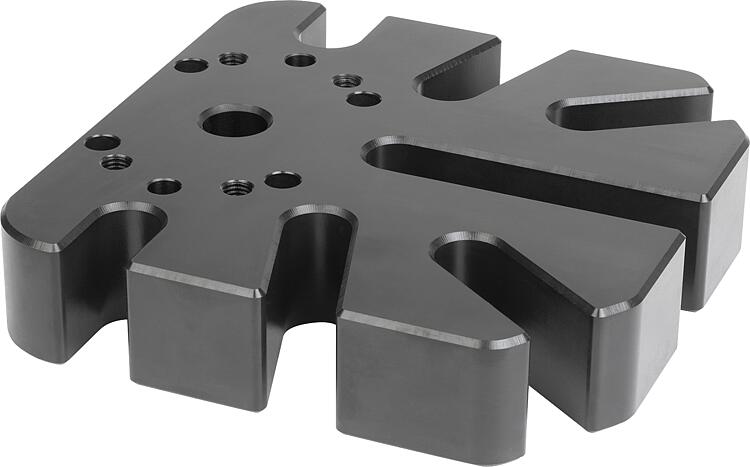 提示:UNILOCK 5 轴通用夹紧底板可匹配到带有格栅系统的机床工作台或 T 型槽导轨中的机床工作台以及格栅板上。由于其结构稳定,此升降机是大型和重型工件的理想基础元件。通过分配固定槽,可灵活适应工件和机床工作台。