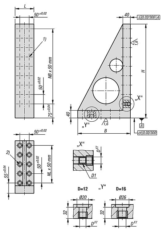 产品说明材料:GJL 300.规格:支撑面和夹紧面经高精度加工处理。提示:栅格间距为 50 ±0.02 mm。 弯板非常适合对工件和夹具进行垂直定位和固定。通过轴肩螺栓 07533 将弯板在工作平台 01126 和 01148 上定位和固定。 通过轴肩螺栓 07533-112065 固定系统尺寸 M12 的弯板。 通过轴肩螺栓 07533-116065 固定系统尺寸 M16 的弯板。 用于锁闭栅格孔的保护塞必须另行订购。图纸提示:特点: 下载此处为收集信息的 PDF:
