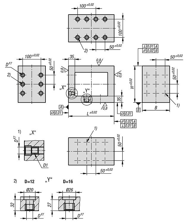 产品说明材料:GJL 300.规格:支撑面和夹紧面经打磨处理。提示:栅格间距 50 ±0.02 mm。 支架用于模块化夹具的搭建。其可以精确定位并安装在栅格系统上。如此栅格孔的位置可延续至较高夹紧面上。 支架还可用作夹紧较小工件的主体。 通过轴肩螺栓 07533-112065 固定系统尺寸 M12 的支架。通过轴肩螺栓 07533-116065 固定系统尺寸 M16 的支架。 用于锁闭栅格孔的保护塞必须另行订购。图纸提示:特点: 下载此处为收集信息的 PDF: