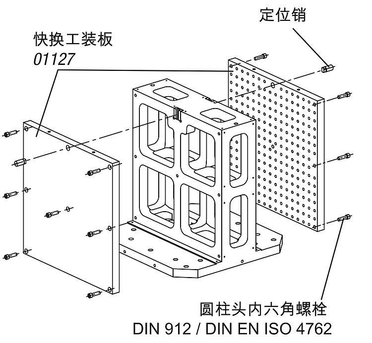供货范围含运输用环形螺栓,以及 2 个用于定位快换工装板的定位销。