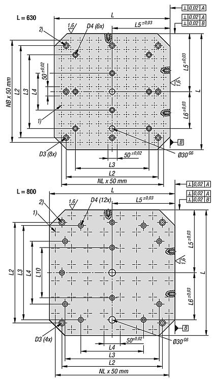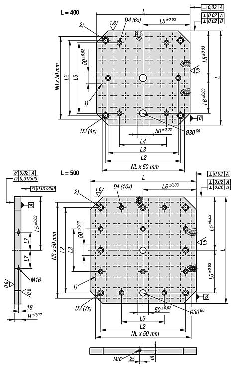 产品说明材料:GJL 300.规格:支撑面和夹紧面经打磨处理。提示:栅格间距 50 ±0.02 mm。