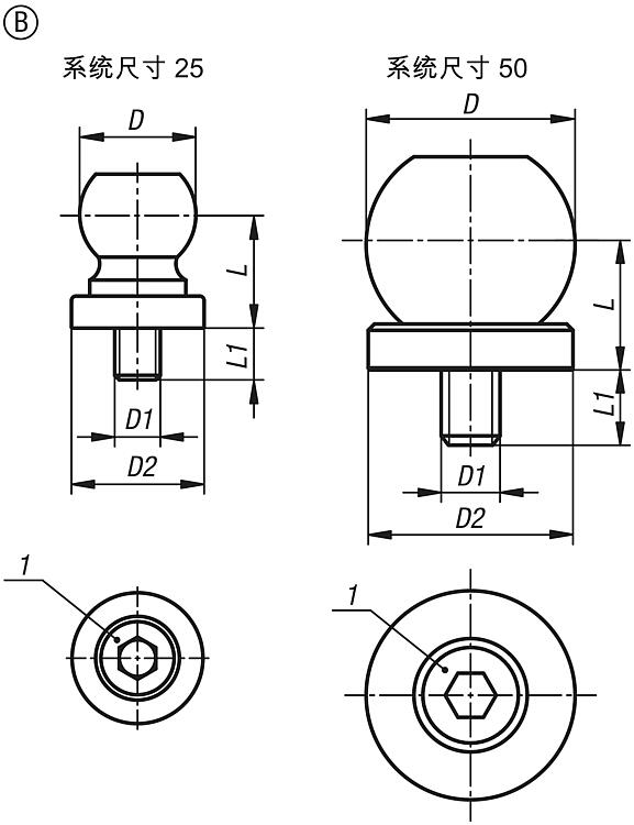 | 02408-225 | B | 25 | 25,4 | M10 | 29 | 25 | 11 |  | | 根据要求 | | | 02408-250 | B | 50 | 50 | M16 | 49 | 30 | 20,5 |  | | 根据要求 | |