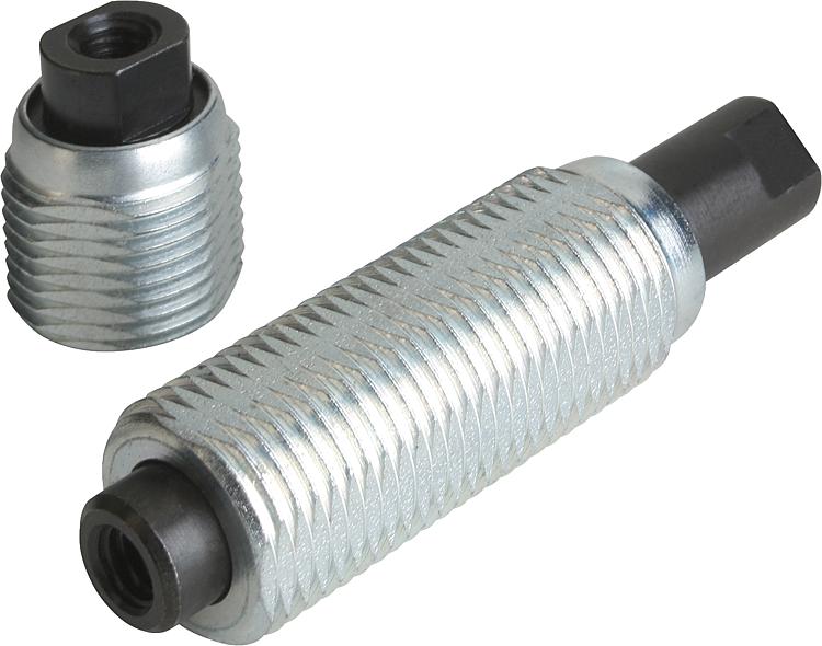产品说明材料:钢制。规格:套筒 蓝色镀锌。 顶销 黑色氧化。提示:通过顶销两侧的螺纹孔可以装入各种嵌入件实现多种用途,例如:棱柱、柱塞、自适应顶脚、按钮、卡爪等。装配:为防止螺纹套筒的脱落,建议使用 LOCTITE 螺栓胶 97990-243。特点: 下载此处为收集信息的 PDF: