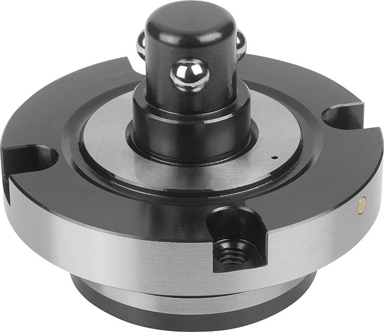 通过控制带接口“打开”的定位柱,可机械地松开 3 个夹紧顶珠。3 个夹紧顶珠向内缩回,并且可快速更换夹具。若要夹紧,需排除“打开”接口中的空气,然后“夹紧”接口接收定位柱上的空气。3 个夹紧顶珠将再次机械地向外移动,并且更换夹具被夹紧。