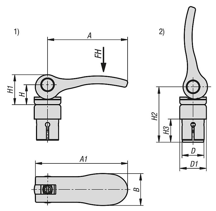 优点:无需工具即可将两个部件连接起来。部件在夹紧状态下会处于理想的居中位置。由于紧凑型结构,带有偏心把手的弹性夹头也可插入盲孔。孔没有特殊的尺寸要求。表面和形状也不具备特殊的属性。工作原理:夹紧系统在开放状态下引入孔中。闭合过程启动时,弹性夹头膨胀并夹紧在下方部件中。内置碟簧组产生的下拉效果会在闭合过程结束时将两个部件相互夹紧在一起。图纸提示: