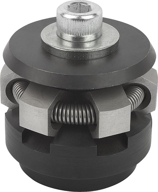 拉力弹簧 1.4310。规格:主体经硬化和黑色氧化处理。 顶珠和六角经硬化和打磨处理。提示: B 型:带有六角,适用表面敏感型孔壁。技术参数:重复精度 ±0.025 同轴精度 ±0.05应用:用于在定位孔中的定心和夹紧。优点:- 精确的自定心。 - 夹紧不易变形。 - 较大的调整行程。 - 较小的结构高度。图纸提示:A 型: 带有顶珠,适用可适度承压的开孔中使用。 B 型: 带有六角,适用表面敏感型孔壁。