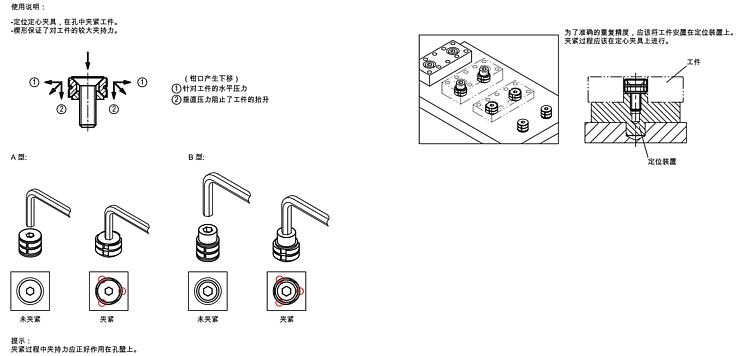 产品说明材料:调制钢。规格:经硬化 (33-39 HRC) 和黑色氧化处理。提示:定心夹具实现在孔内定中心和夹紧工件。