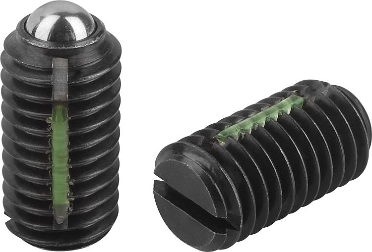 带一字槽和顶珠的弹簧柱塞,钢制,标准弹簧弹力,带螺纹锁