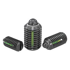 带一字槽和止动顶销的弹簧柱塞,钢制,轻弹簧弹力,带螺纹锁 |