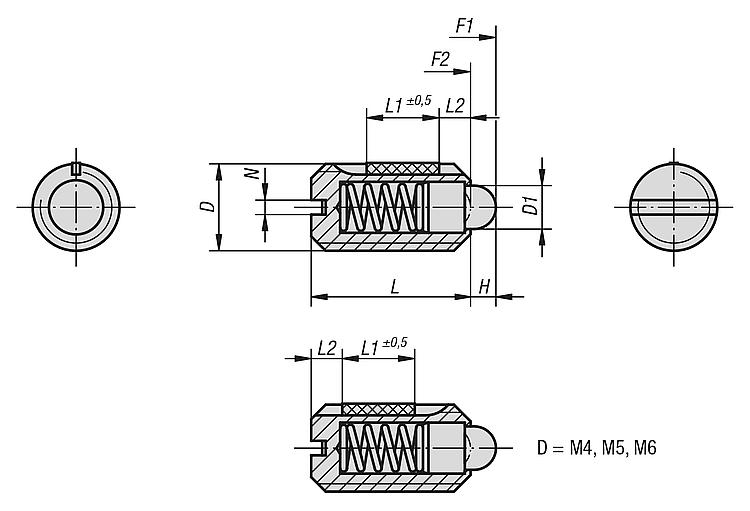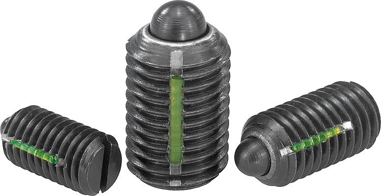 带一字槽和止动顶销的弹簧柱塞,钢制,标准弹簧弹力,带螺纹锁 |