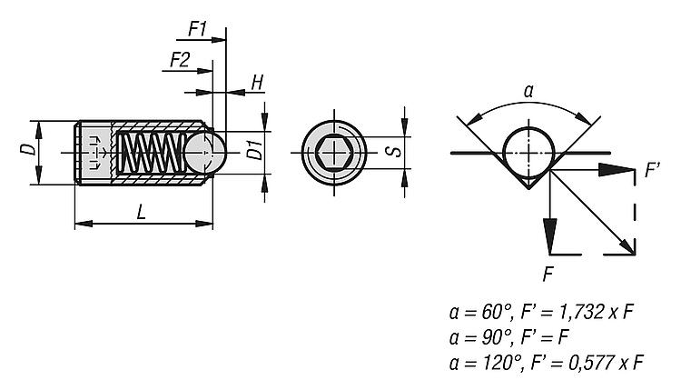 带内六角和顶珠的弹簧柱塞,不锈钢,标准弹簧弹力 |