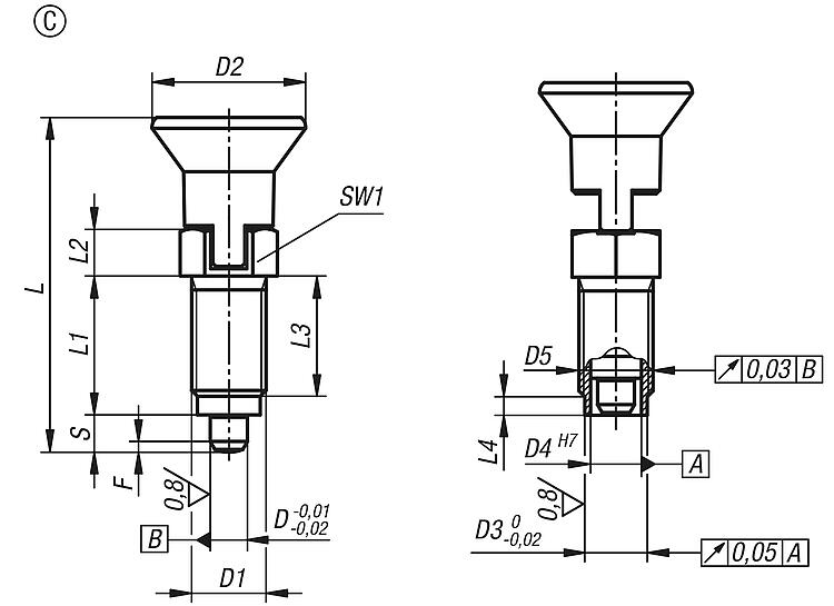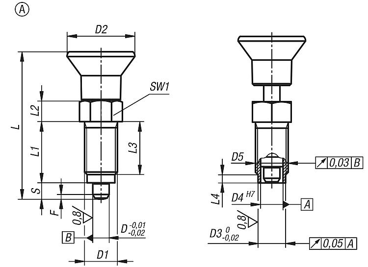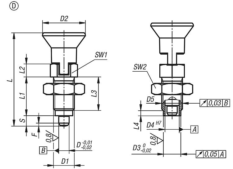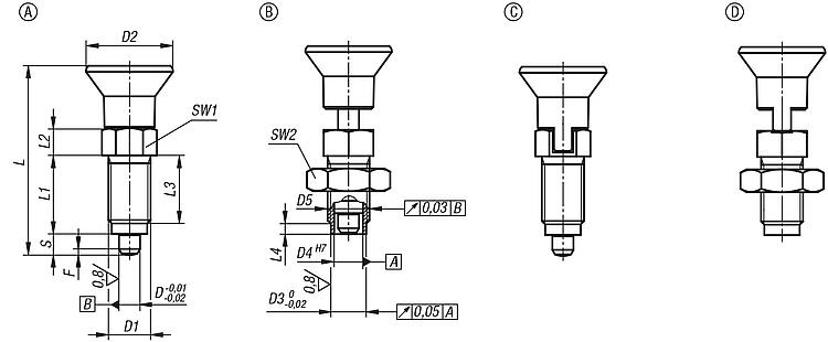 黑灰色 RAL7021 蘑菇头把手。 提示:如果需要承受更高侧向力时,需要选用配套的定位衬套。装配:使用螺纹套筒的前端导向时,建议在攻丝之前加工导向孔。根据要求:特殊类型。附件:配套的圆柱定位衬套 03089。 锁紧螺母 07212…。图纸提示:A型: 不带拔出锁槽, 不带锁紧螺母 B型: 不带拔出锁槽, 带锁紧螺母 C型: 带拔出锁槽, 不带锁紧螺母 D型: 带拔出锁槽, 带锁紧螺母 特点: 下载此处为收集信息的 PDF: