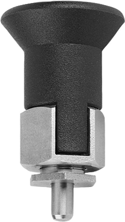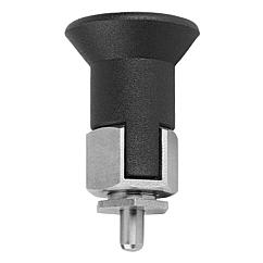 用于薄壁部件钢制或不锈钢锁紧柱塞,带塑料蘑菇头把手和拔出锁槽