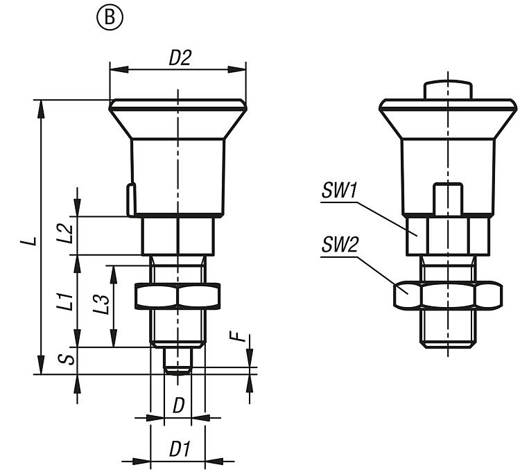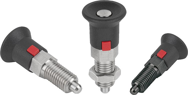 通过压紧旋钮进行锁止操作。 红色释放按钮可以实现锁定位置的更改。材料:钢制规格: 带螺纹套筒和易切削钢柱塞顶销。