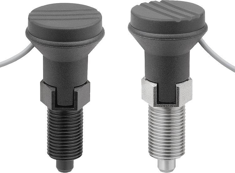 03090-20_C钢制或不锈钢分度销,带塑料蘑菇头把手和状态传感器,有线和拔出锁槽 |