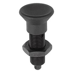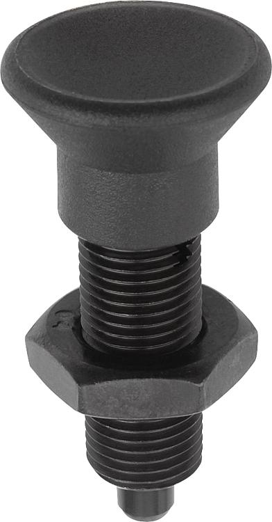03093_H钢制或不锈钢无凸缘锁紧柱塞,带塑料蘑菇头把手和锁紧螺母 |