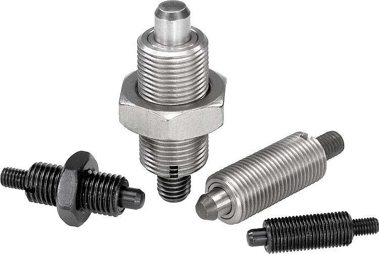 凸出的顶销杆上可以安装特定的把手。此外,这种柱塞还可以通过电控气缸实现自动控制,或者通过鲍登线进行远程控制。 材料:规格:钢制规格: 螺纹套筒经氧化处理。 锁销经过硬化、研磨和氧化处理。