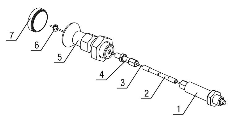 控制机构: 控制机构带塑料盖。图纸提示:1) 锁紧柱塞 2) 鲍登索套 3) 鲍登索 4) 调节螺丝 5) 控制机构 6) 螺纹接线柱 7) 盖