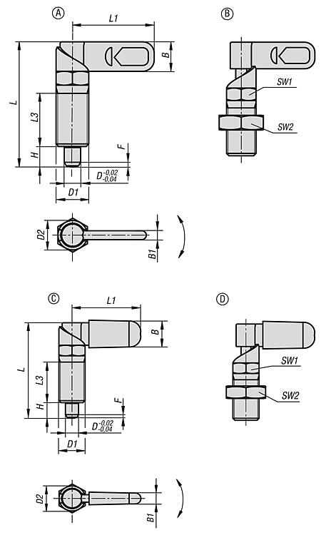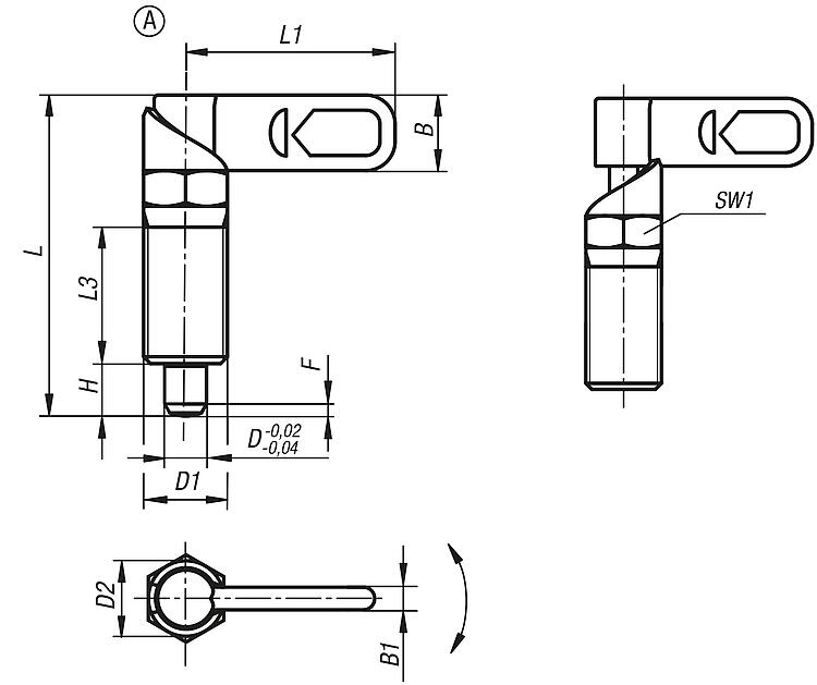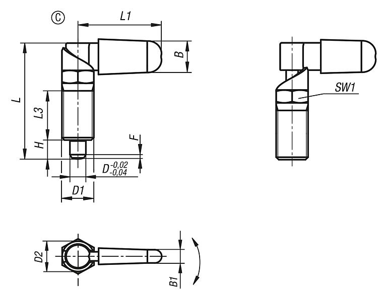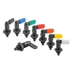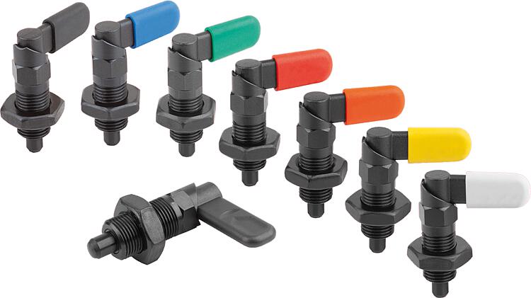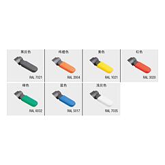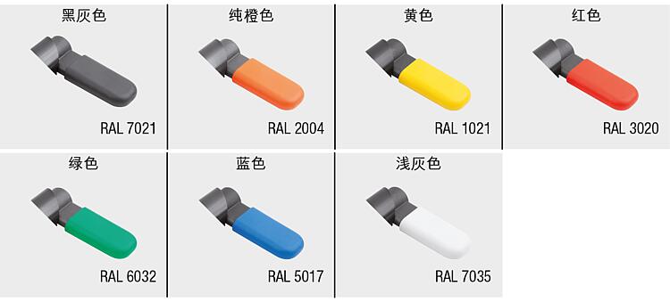 产品说明产品描述:用凸轮旋柄柱塞可防止锁紧位置由于受横向力的作用而发生移动。 手柄旋转 180° 柱塞顶销缩回,因此可以改变锁定位置。 套筒上有沟槽保证手柄可以维持在该位置,从而使柱塞顶销保持缩回状态。 材料:锁止器 1.0503。 钢制螺纹套筒和柱塞顶销。 压力弹簧 1.4310。 热塑 PA 闩盖。 规格:螺纹套筒和锁扣经黑色氧化处理。 柱塞顶销硬化,经打磨和黑色氧化。 压力弹簧亮色。 不同颜色的螺栓帽: - 深灰色 RAL 7021。 - 纯橙色 RAL 2004。 - 油菜黄色 RAL 102。 - 交通红色 RAL 3020。 - 信号绿色 RAL 6032。 - 交通蓝色 RAL 5017。 - 浅灰色 RAL 7035。 优点:手柄旋转 180° 柱塞顶销缩回。 可选择彩色塑料螺栓帽。 带六角的套筒用作安装辅助。 根据要求:特殊类型。 附件:固定支架 03099。 定位衬套 03099-50, 03099-60, 03099-61。 图纸提示:A 型:无螺栓帽,无螺母。 B 型:无螺栓帽,带螺母。 C 型:带螺栓帽,无螺母。 D 型:带螺栓帽,带螺母。