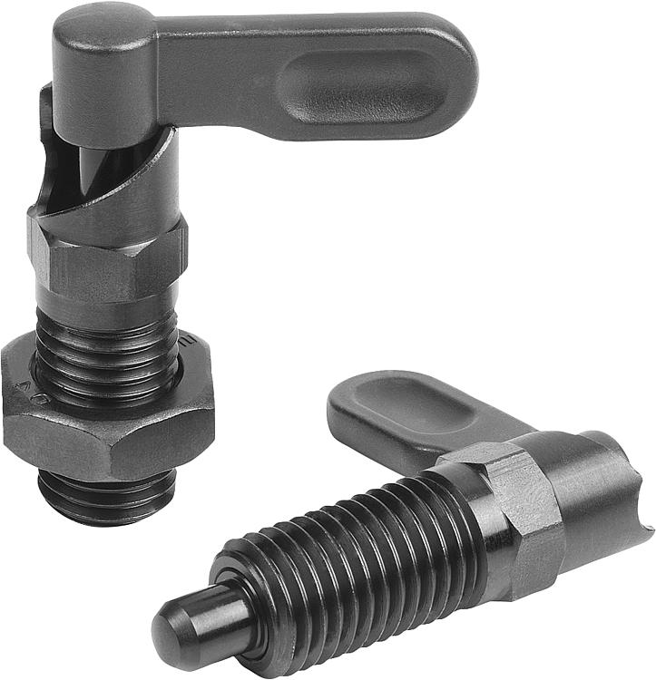 产品说明材料:钢制, 强度等级5.8。规格:黑色氧化 顶销经硬化、抛光处理。提示:手柄型分度销用在顶销不需要一直伸出的场合。手柄旋转 180° 销头缩回。 套筒上有沟槽保证手柄可以维持在该位置。 通过 180° 的止动面从卡槽跳出,以此防止销头重新伸出。 通过选择止动面来设定锁舌的旋转方向。图纸提示:A型: 手柄未喷涂, 无螺母 C型: 手柄喷涂, 无螺母 B型: 手柄未喷涂, 带螺母 D型: 手柄喷涂, 带螺母