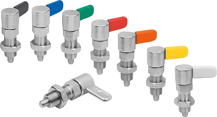 应用:由于其封闭式设计,带内导轨的凸轮旋柄柱塞可以安装在如灰尘和飞溅火花等污染严重的地方。优点:- 将手柄旋转 180°,柱塞顶销即可缩回。