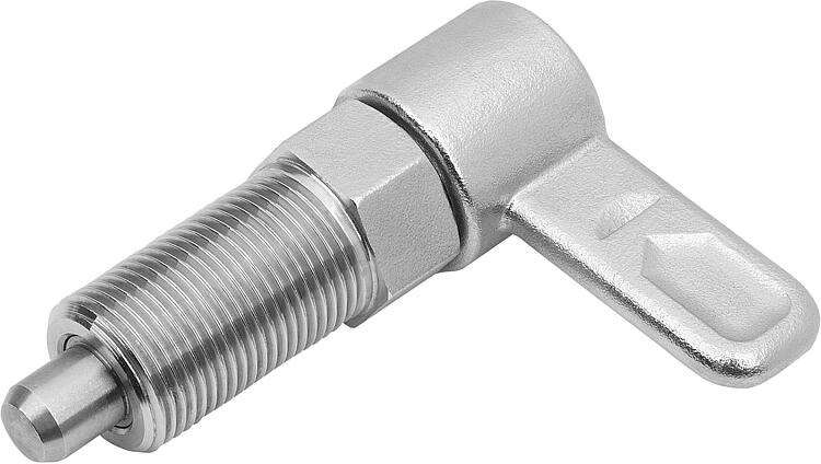 产品说明产品描述:用凸轮旋柄柱塞可防止锁紧位置由于受横向力的作用而发生移动。手柄旋转 180° 柱塞顶销缩回,因此可以改变锁紧位置。凹槽确保手柄保持在此位置,柱塞顶销保持缩回状态。材料:螺纹套筒、和手柄 1.4308。