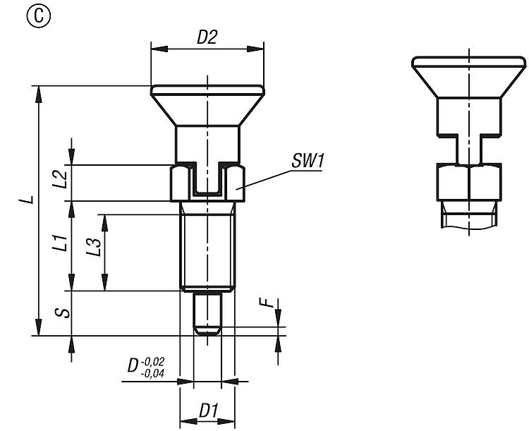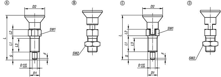RAL7021 黑灰色或 RAL3020 交通红色蘑菇头把手。提示:分度销用于固定工件防止侧向位置移动。只有将顶销拔出后才能移动到新位置。根据要求:特殊类型。附件:间隔环 03089。 连接嵌入件 用于薄壁部件 03094-10。图纸提示:A型: 不带拔出锁槽, 不带锁紧螺母 B型: 不带拔出锁槽, 带锁紧螺母 C型: 带拔出锁槽, 不带锁紧螺母 D型: 带拔出锁槽, 带锁紧螺母 下载此处为收集信息的 PDF:
