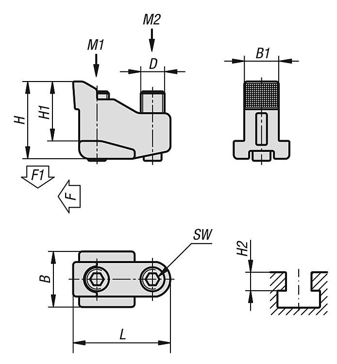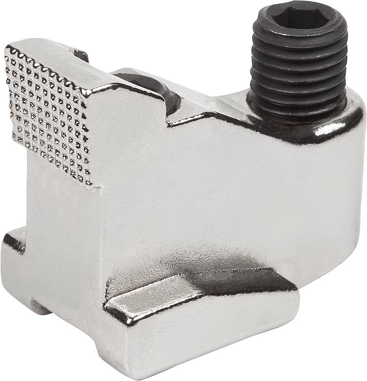 提示:T 型槽夹钳可夹紧特别低的工件。通过下压力将工件更牢固地压在机床工作台上。应用:1. 将 T 型槽夹钳推入到机床工作台的 T 型槽中,直至工件。