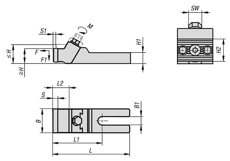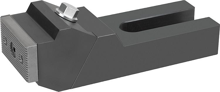 提示:两侧均可使用夹钳。用于经加工工件的光滑面,用于毛坯夹紧面的齿面。为了将稳定型夹钳固定在工作台上,可使用两个夹紧螺栓。根据槽宽,用于 T 形槽 K07040 的螺栓适合用作紧固螺钉。这些螺栓必须单独订购。