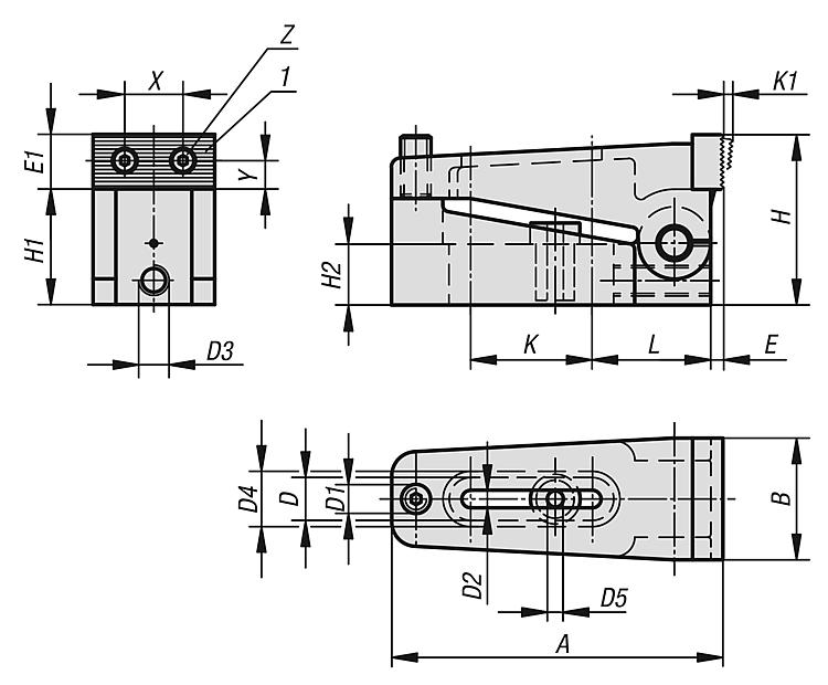 提示:夹钳具有用于毛坯夹紧面的齿面。夹紧作用的同时会产生下压力。可以在螺纹 D3 中插入一个埋头螺栓,以防止在夹紧过程中的反向滑动。图纸提示: