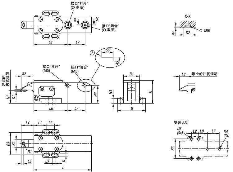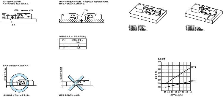 提示:气动侧方夹紧块适用于夹紧工件。侧方夹紧块为气动控制。通过压臂较大的摆入角可自如放入或取出工件。以此来保证工件最佳的可操作性。壳体支脚提供通用的组合式形状,可以最佳方式使侧方夹紧块适应待夹紧的工件。侧方夹紧块的压臂内可额外装入光滑面或齿面的自适应球头端面。以此可夹紧坯件或预加工件。